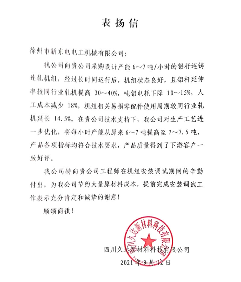 我公司向貴公司采購設(shè)計產(chǎn)能6~7噸/小時的鋁桿連鑄連軋機組,經(jīng)過長時間運行后,機組狀態(tài)良好,且鋁桿延伸率較同行業(yè)軋機提高30~40%,噸鋁電耗下降10~15%,人工成本減少l8%,機組相關(guān)易損零配件使用周期較同行業(yè)軋機延長14.5%。在貴公司技術(shù)支持下,我公司對生產(chǎn)工藝進一步優(yōu)化,將每小時產(chǎn)能從原來6~7噸提高至7~7.5噸,產(chǎn)品各項指標(biāo)均符合技術(shù)要求,產(chǎn)品質(zhì)量得到了下游客戶一致好評。