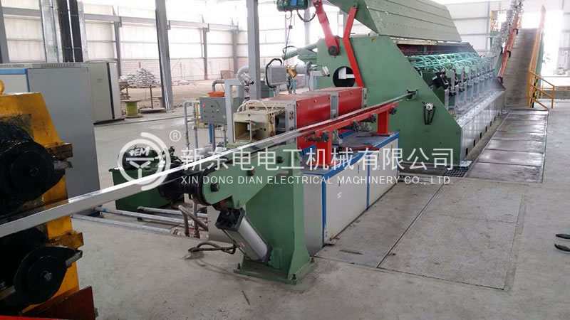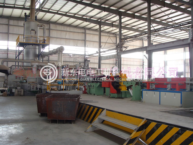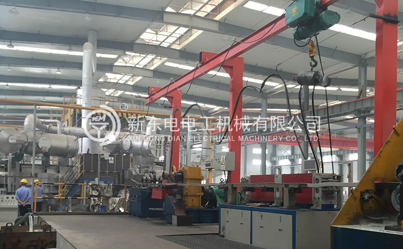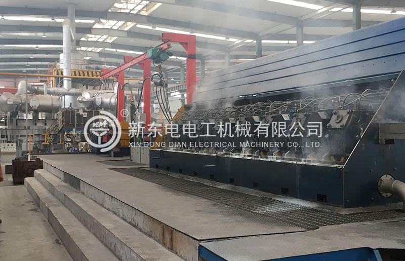 本設(shè)備采用新型四輪式連鑄機和連鑄連軋工藝生產(chǎn)¢9.5mm的鋁合金桿 (鋁合金牌號為1系列全部,3系列全部,6系列,8系列),鋁合金桿生產(chǎn)中,感應(yīng)加熱器保證鑄坯進軋的工藝溫度要求,具有鑄錠加熱調(diào)節(jié)功能,連軋機具有主動喂料和堆桿停車功能,連續(xù)淬火裝置有在線淬火功能,收線導(dǎo)管出口處裝有吹水裝置,以清除鋁合金桿表面水分,同時安裝有主動牽引裝置,保證鋁合金桿的順利導(dǎo)出。圓弧導(dǎo)向管采用滾輪導(dǎo)向結(jié)構(gòu),減少鋁合金桿表面擦傷。繞桿方式為離心甩頭式,一方面使鋁合金桿在進入收線框前給予預(yù)變形;另一方面使其在軋制過程中若發(fā)生斷桿,桿尾能自動到收線框內(nèi)。使其換盤時不亂桿,以保證連續(xù)雙盤成圈裝置進行收線。